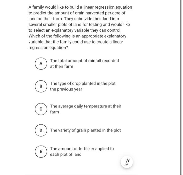 A Family Would Like To Build A Linear Regression - A family would like to build a linear regression equation to predict the amount of grain harvested per acre of land on their farm. Which of the following is an appropriate explanatory variable that the family could use to create a linear regression equation? Linear regression might sound like a term best left to statisticians, but it’s actually a fantastic tool for anyone looking to make sense of data trends. Verify that the model fits. The linear regression family in ri will focus on how you. Linear regression might sound like one of those scary terms you hear in a statistics class, but it’s actually a handy tool for anyone dealing with data. In this post we will go through examples of how we can specify different linear models (linear regressions) in r. They subdivide their land into several smaller plots of land for. They subdivide their land into several smaller plots of land for testing and would like to select an explanatory variable they can control. In a simple linear regression analysis, we are mostly interested in the coefficient (slope). Linear regression might sound like a term better suited for a math textbook, but it’s actually a pretty handy tool you can use in everyday work, especially with the help of excel. A family would like to build a linear regression equation to predict the amount of grain harvested per acre of land on their farm. In a simple linear regression analysis, we are mostly interested in the coefficient (slope). They subdivide their land into several smaller plots of land for. A family would like to build a linear regression equation to predict the amount of grain harvested per acre of land on their farm. Linear regression might sound like a term best left to statisticians, but it’s actually a fantastic tool for anyone looking to make sense of data trends. If we think that the points show a linear relationship, we would like to draw a line on the scatterplot. Linear regression might sound like one of those scary terms you hear in a statistics class, but it’s actually a handy tool for anyone dealing with data. Which of the following is an appropriate explanatory variable that the family could use to create a linear regression equation? Ensure your data is clean and free from. Linear regression might sound like a term better suited for a math textbook, but it’s actually a pretty handy tool you can use in everyday work, especially with the help of excel. The most appropriate explanatory variable for the family to use in building a linear regression equation is the amount of fertilizer applied to each plot of land. In. A family would like to build a linear regression equation to predict the amount of grain harvested per acre of land on their farm. They subdivide their land into several smaller plots of land for. They subdivide their land into several smaller plots of land for. Linear regression might sound like a term better suited for a math textbook, but. A family would like to build a linear regression equation to predict the amount of grain harvested per acre of land on their farm. Verify that the model fits. Constructing scatter plots, classifying associations, and determining correlation. There are 2 steps to solve this one. The goal here is to predict the. If we think that the points show a linear relationship, we would like to draw a line on the scatterplot. They subdivide their land into several smaller plots of land for. A family would like to build a linear regression equation to predict the amount of grain harvested per acre of land on their farm. We use the following steps. Linear regression might sound like one of those scary terms you hear in a statistics class, but it’s actually a handy tool for anyone dealing with data. A family would like to build a linear regression equation to predict the amount of grain harvested per acre of land on their farm. A family would like to build a linear regression. We use the following steps to make predictions with a regression model: They subdivide their land into several smaller plots of land for. A family would like to build a linear regression equation to predict the amount of grain harvested per acre of land on their farm. They subdivide their land into several smaller plots of land for. Linear regression. In this project we develop our model to analyze the relationship between the. They subdivide their land into several smaller plots of land for. Linear regression analysis is a family of statistical methods that model the linear relationship between. A family would like to build a linear regression equation to predict the amount of grain harvested per acre of land. A family would like to build a linear regression equation to predict the amount of grain harvested per acre of land on their farm. A family would like to build a linear regression equation to predict the amount of grain harvested per acre of land on their farm. Like any tool, linear regression in excel isn't without its challenges. If. In linear regression, we specified models with parameters, \(\beta_j\) and fit the model by finding the best values of these parameters. We use the following steps to make predictions with a regression model: If we think that the points show a linear relationship, we would like to draw a line on the scatterplot. There are 2 steps to solve this. We have discussed several ways to build this understanding: Verify that the model fits. They subdivide their land into several smaller plots of land for testing and would like to select an explanatory variable they can control. The most appropriate explanatory variable for the family to use in building a linear regression equation is the amount of fertilizer applied to. We use the following steps to make predictions with a regression model: In this post we will go through examples of how we can specify different linear models (linear regressions) in r. They subdivide their land into several smaller plots of