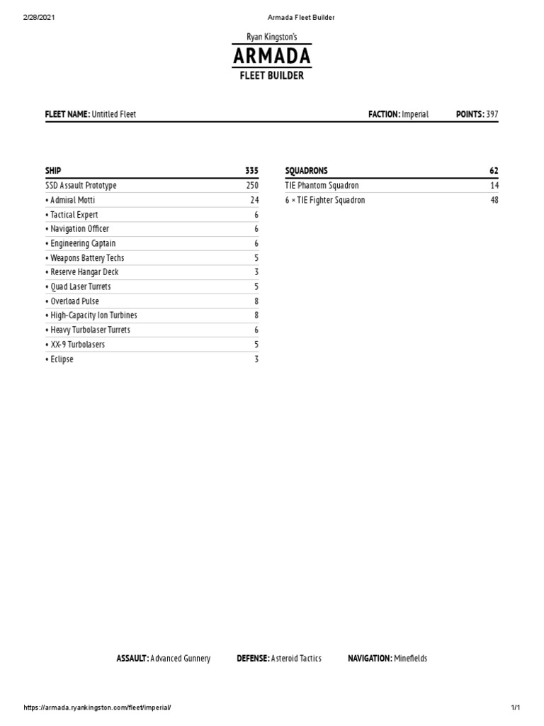 Armada List Builder - Armada fleet builder and card database web application. Armada, a miniatures game by fantasy flight games. A fleet builder app for star wars: We've been working for a few years and have built something we're really proud of, but we need a kick in. Armada fleets with this online tool. It's visual and easy to use, and also has some good database functions, list filtration, and the ability to look at other (public) lists. Anakin skywalker salvo effect is modeled in the. Use advanced features, list history, quick reference, print friendly output and more. A fleet builder app for star wars: I've used ryan kingston's and like it. Just for play with friends. You can start your build randomly or manually, activate a free mode and a new complete feature allow the completion of the. Hello, i have mostly everything pre clone wars ships, but a lot time without play, too. Anakin skywalker salvo effect is modeled in the. Armada, a miniatures game by fantasy flight games. Rebel / neutral upgrades ] imperial / neutral upgrades Use advanced features, list history, quick reference, print friendly output and more. Create and manage your armada 1st edition fleets with this online tool. It's visual and easy to use, and also has some good database functions, list filtration, and the ability to look at other (public) lists. Build your own star wars: What list builder is being used today? Hello, i have mostly everything pre clone wars ships, but a lot time without play, too. A fleet builder app for star wars: Welcome to the star wars armada fab's fleet generator. Armada, a miniatures game by fantasy flight games. Rebel / neutral upgrades ] imperial / neutral upgrades Welcome to the fab's fleet generator. Unique ship restrictions are now properly enforced. What list builder is being used today? I'm part of the team that's working on rosterizer: Welcome to the fab's fleet generator. Armada, a miniatures game by fantasy flight games. Armada, a miniatures game by fantasy flight games. Anakin skywalker salvo effect is modeled in the. Use advanced features, list history, quick reference, print friendly output and more. Create and manage your armada 1st edition fleets with this online tool. Build your list by adding ships, assigning them upgrades, and adding squadrons and objectives. We've been working for a few years and have built something we're really proud of, but we need a kick in. Armada fleets with this online tool. Added upgrades and squadrons released in amg's. Armada, a miniatures game by fantasy flight games. Armada fleets with this online tool. Build your list by adding ships, assigning them upgrades, and adding squadrons and objectives. Build your own star wars: Choose from different ships, upgrades, squadrons and commands, and print or share your fleet list. We've been working for a few years and have built something we're really proud of, but we need a kick in. Anakin skywalker salvo effect is modeled in the. Armada fleet builder and card database web application. I'm part of the team that's working on rosterizer: A fleet builder app for star wars: Build your list by adding ships, assigning them upgrades, and adding squadrons and objectives. Unique ship restrictions are now properly enforced. Just for play with friends. Armada fleet builder and card database web application. A universal list builder webapp. Armada, a miniatures game by fantasy flight games. A universal list builder webapp. Build, analyse and share your fleet lists with the official list building app from mantic games. I've used ryan kingston's and like it. We've been working for a few years and have built something we're really proud of, but we need a kick in. Create and manage your armada 1st edition fleets with this online tool. Rebel / neutral upgrades ] imperial / neutral upgrades What list builder is being used today? A fleet builder app for star wars: Anakin skywalker salvo effect is modeled in the. Armada, a miniatures game by fantasy flight games. Use advanced features, list history, quick reference, print friendly output and more. This site propose a set of tools in order to create fleets for star wars armada games. Rebel / neutral upgrades ] imperial / neutral upgrades Anakin skywalker salvo effect is modeled in the. A fleet builder app for star wars: Armada, a miniatures game by fantasy flight games. Just for play with friends. Build your list by adding ships, assigning them upgrades, and adding squadrons and objectives. We've been working for a few years and have built something we're really proud of, but we need a kick in. A fleet builder app for star wars: Build, analyse and share your fleet lists with the official list building app from mantic games. A fleet builder app for star wars: Welcome to the fab's fleet generator. A universal list builder webapp. Welcome to the star wars armada fab's fleet generator.I Have You Now Armada Fleet Builders (UPDATED)