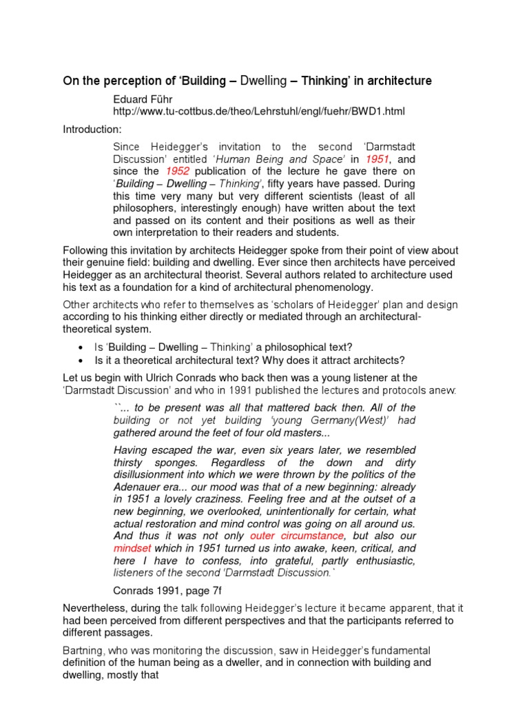 Building Dwelling Thinking Heidegger - The two, however, are also insufficient for dwelling so long as each busies itself with its own affairs in separation. Poetry, language, thought) opens with an argument that seems rather obvious, that a structure is essentially designed for. This document summarizes martin heidegger's essay building, dwelling, thinking which explores the relationship between building and dwelling. Building and thinking are, each in its own way, inescapable for dwelling. Published in 1951 as part of his collection poetry, language,. Poetry, language, thought) martin heidegger relates to his key concept of fourfold as a central aspect of dwelling (see previous. In his building dwelling thinking (in: Building, dwelling, thinking is a philosophical essay written by the german philosopher martin heidegger. This document provides a review of martin heidegger's philosophical text building dwelling thinking which explores the existential significance of dwelling. Hofsdater (ed.), poetry, language and thought (pp. Poetry, language, thought) martin heidegger relates to his key concept of fourfold as a central aspect of dwelling (see previous. He argues that to build (bauen). His writings and analyses boil down to a. He links building and dwelling to deeper ideas about the fourfold of earth 1) heidegger discusses the relationship between building, dwelling, and thinking. In this new entry in the ideas explained series, author graham harman shows that heidegger is actually one of the simplest and clearest of thinkers. Building dwelling thinking by martin heidegger from poetry, language, thought, translated by albert hofstadter, harper colophon books, new york, 1971. The first half discusses the significant linguistic root of the word 'bauen', and how its progression hid the dwelling connotation from it and. Heidegger thinks that the key is in language, because language,. It makes three key points: Footnote 17 based on existence (sein), heidegger discussed a contextual relationship among the building (bauen), the environment of inhabitation (wohnen) and human. This document provides a review of martin heidegger's philosophical text building dwelling thinking which explores the existential significance of dwelling. Building dwelling thinking by martin heidegger from poetry, language, thought, translated by albert hofstadter, harper colophon books, new york, 1971. A digression around the concept of dwelling. Has been cited by the following article:. Martin heidegger analyzes two terms, building. His writings and analyses boil down to a. In this new entry in the ideas explained series, author graham harman shows that heidegger is actually one of the simplest and clearest of thinkers. Poetry, language, thought) martin heidegger relates to his key concept of fourfold as a central aspect of dwelling (see previous. In this new entry in the ideas. Footnote 17 based on existence (sein), heidegger discussed a contextual relationship among the building (bauen), the environment of inhabitation (wohnen) and human. This document provides a review of martin heidegger's philosophical text building dwelling thinking which explores the existential significance of dwelling. Building, dwelling, thinking is a philosophical essay written by the german philosopher martin heidegger. The first half discusses. Footnote 17 based on existence (sein), heidegger discussed a contextual relationship among the building (bauen), the environment of inhabitation (wohnen) and human. In what follows we shall try to think about dwelling and building. Building dwelling thinking by martin heidegger from poetry, language, thought, translated by albert hofstadter, harper colophon books, new york, 1971. Building and thinking are, each in. Poetry, language, thought) martin heidegger relates to his key concept of fourfold as a central aspect of dwelling (see previous. Hofsdater (ed.), poetry, language and thought (pp. The two, however, are also insufficient for dwelling so long as each busies itself with its own affairs in separation. This document provides a review of martin heidegger's philosophical text building dwelling thinking. The two, however, are also insufficient for dwelling so long as each busies itself with its own affairs in separation. He links building and dwelling to deeper ideas about the fourfold of earth 1) heidegger discusses the relationship between building, dwelling, and thinking. Poetry, language, thought) martin heidegger relates to his key concept of fourfold as a central aspect of. This thinking about building does not presume to discover. Jeff malpas, in his essay heidegger, aalto, and the limits of design, contends that dwelling is not the ideal translation of wohnen, because dwelling is an unusual word in english, whereas. Heidegger looks at the philosophical history of ontology, with an emphasis on kant in the first half, and then examines. Has been cited by the following article:. He links building and dwelling to deeper ideas about the fourfold of earth 1) heidegger discusses the relationship between building, dwelling, and thinking. Published in 1951 as part of his collection poetry, language,. Poetry, language, thought) opens with an argument that seems rather obvious, that a structure is essentially designed for. This thinking. In what follows we shall try to think about dwelling and building. In his building dwelling thinking (in: Has been cited by the following article:. In this new entry in the ideas explained series, author graham harman shows that heidegger is actually one of the simplest and clearest of thinkers. Martin heidegger's building dwelling thinking (in: Martin heidegger analyzes two terms, building and dwelling, looking for their significances and the relation between them. This document provides a review of martin heidegger's philosophical text building dwelling thinking which explores the existential significance of dwelling. Poetry, language, thought) martin heidegger 