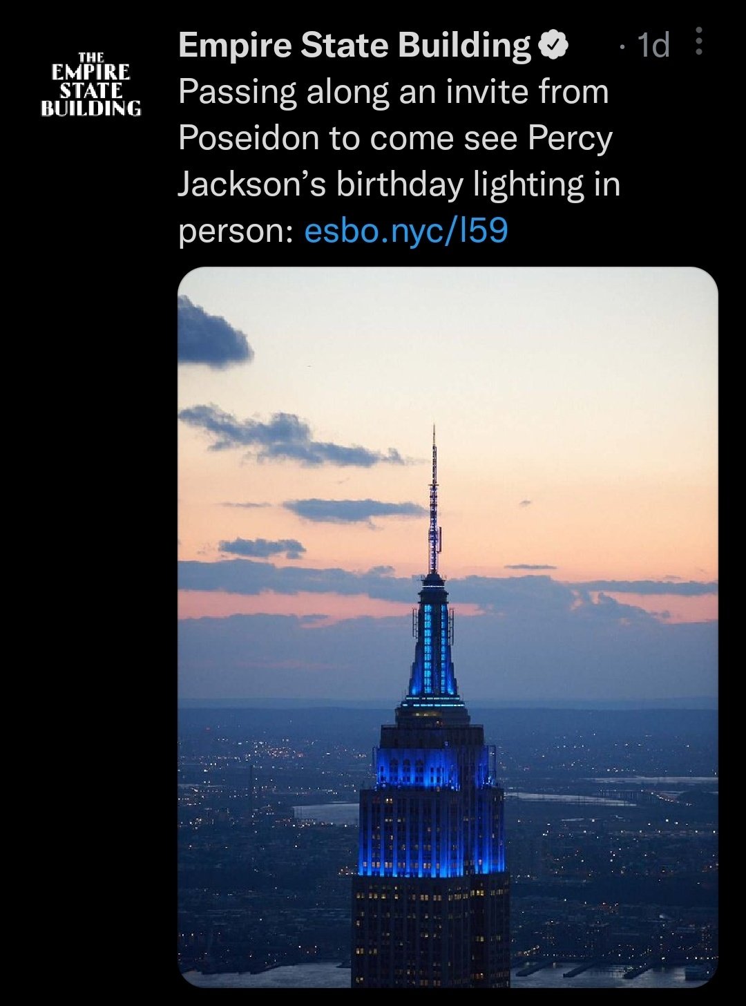 [pjo] The Empire State Building lit up blue in celebration of Percy
