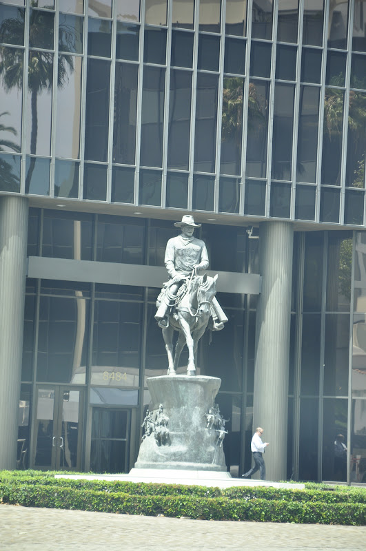 A Large Statue Of John Wayne In Cowboy Gear, Rifle In Hand, Riding A Galloping Horse Is In Front Of The Main Entrance To The Building;
