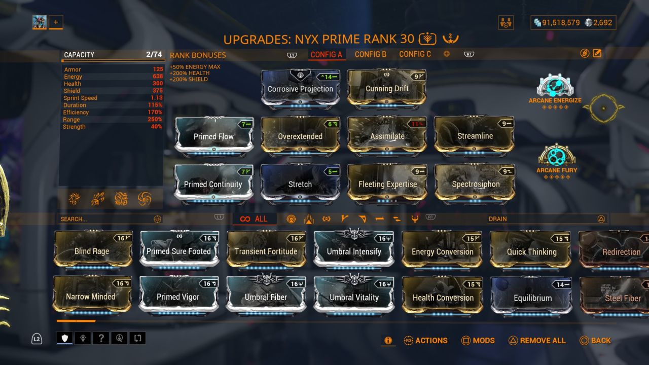 In The Screenshot Below Of My Nyx Prime, You Can See I've Built Her With High Duration (223%), Range (190%), And Efficiency (170%).