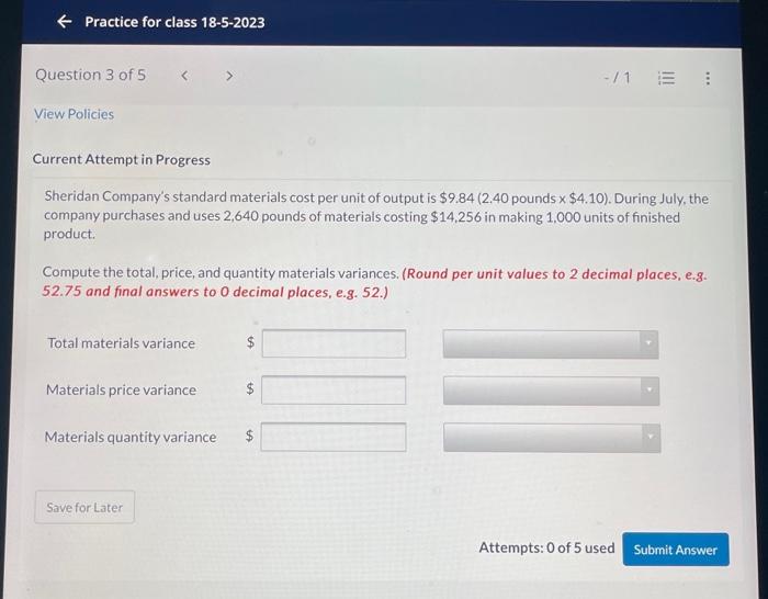 Solved Sheridan Company's standard materials cost per unit