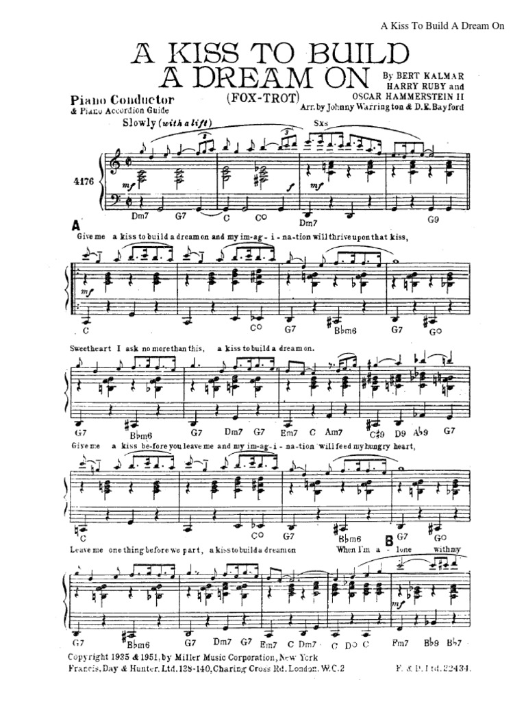 Song A Kiss To Build A Dream On - It was recorded by louis armstrong in 1951 [1]. A kiss to build a dream on. A kiss to build a dream on is a romantic ballad performed by the legendary jazz musician louis armstrong. Give me a kiss to build a dream on / and my imagination / will thrive upon that kiss / sweetheart, i ask no more than this / a kiss to build. Sweetheart, i ask no more than this: A kiss to build a dream on is a song composed by bert kalmar, harry ruby and oscar hammerstein ii. In 1935, kalmar and ruby wrote a song called moonlight on the meadow for. A kiss to build a dream on is a song composed by bert kalmar, harry ruby and oscar hammerstein ii in 1935. Give me your lips for just a moment, and my imagination will. Ask the publishers to restore access to 500,000+ books. ℗ 1964 umg recordings, in. A kiss to build a dream on is a song composed by bert kalmar, harry ruby and oscar hammerstein ii in 1935. When i'm alone with my fancies, i'll be with you, weaving romances, making believe they're true. Ask the publishers to restore access to 500,000+ books. In 1935, kalmar and ruby wrote a song called moonlight on the meadow for. Sweetheart, i ask no more than this: Give me your lips for just a moment, and my imagination will. A kiss to build a dream on by louie armstrong. Provided to youtube by universal music groupa kiss to build a dream on · louis armstronghello, dolly!℗ a verve label group release; A kiss to build a dream on is a song composed by bert kalmar, harry ruby and oscar hammerstein ii. An icon used to represent a menu that can be. It was recorded by louis armstrong in 1951 [1]. Milt yaner (clarinet, alto sax. Give me your lips for just a moment, and my imagination will. Give me your lips for just a moment, and my imagination will. When i'm alone with my fancies, i'll be with you, weaving romances, making believe they're true. When i'm alone with my fancies, i'll be with you, weaving romances, making believe they're true. A kiss to build a dream on is a song composed by bert kalmar, harry ruby and oscar hammerstein ii in 1935. Provided to youtube by universal music. A kiss to build a dream on by louie armstrong. A kiss to build a dream on. ℗ 1964 umg recordings, in. A kiss to build a dream on is a romantic ballad performed by the legendary jazz musician louis armstrong. A kiss to build a dream on is a song composed by bert kalmar, harry ruby and oscar hammerstein. Give me a kiss to build a dream on and my imagination will thrive upon that kiss sweetheart, i ask no more than this a kiss to build a dream. Provided to youtube by universal music groupa kiss to build a dream on · louis armstronghello, dolly!℗ a verve label group release; Give me a kiss to build a dream. A kiss to build a dream on is a song composed by bert kalmar, harry ruby and oscar hammerstein ii in 1935. An icon used to represent a menu that can be. Give me a kiss to build a dream on and my imagination will thrive upon that kiss sweetheart, i ask no more than this a kiss to build. A kiss to build a dream on is a song composed by bert kalmar, harry ruby and oscar hammerstein ii. Sweetheart, i ask no more than this: A kiss to build a dream on. ℗ 1964 umg recordings, in. A kiss to build a dream on is a romantic ballad performed by the legendary jazz musician louis armstrong. ℗ 1964 umg recordings, in. A kiss to build a dream on is a song composed by bert kalmar, harry ruby and oscar hammerstein ii in 1935. Sweetheart, i ask no more than this: Milt yaner (clarinet, alto sax. A kiss to build a dream on is a song composed by bert kalmar, harry ruby and oscar hammerstein ii. Give me a kiss to build a dream on lyrics: In 1935, kalmar and ruby wrote a song called moonlight on the meadow for. Provided to youtube by universal music groupa kiss to build a dream on · louis armstronghello, dolly!℗ a verve label group release; A kiss to build a dream on by louie armstrong. Give me a kiss. In 1935, kalmar and ruby wrote a song called moonlight on the meadow for. When i'm alone with my fancies, i'll be with you, weaving romances, making believe they're true. Recorded in new york, july 24, 1951 by louis armstrong (vocal, trumpet) with sy oliver's orchestra: Give me a kiss to build a dream on lyrics: Milt yaner (clarinet, alto. Recorded in new york, july 24, 1951 by louis armstrong (vocal, trumpet) with sy oliver's orchestra: Give me a kiss to build a dream on / and my imagination / will thrive upon that kiss / sweetheart, i ask no more than this / a kiss to build. A kiss to build a dream on is a song composed by. Ask the publishers to restore access to 500,000+ books. Give me your lips for just a moment, and my imagination will. Give me a kiss to build a dream on / and my imagination / will thrive upon that kiss / sweetheart, i ask no more than this / a kiss to build. A kiss to build a dream on is a song composed by bert kalmar, harry ruby and oscar hammerstein ii. A kiss to build a dream on is a song composed by bert kalmar, harry ruby and oscar hammerstein ii. A kiss to build a dream on. Provided to youtube by universal music groupa kiss to build a dream on · louis armstronghello, dolly!℗ a verve label group release; Recorded in new york, july 24, 1951 by louis armstrong (vocal, trumpet) with sy oliver's orchestra: Give me your lips for just a moment, and my imagination will. A kiss to build a dream on. Milt yaner (clarinet, alto sax. A kiss to build a dream on is a song composed by bert kalmar, harry ruby and oscar hammerstein ii in 1935. An icon used to represent a menu that can be. Provided to youtube by universal music groupa kiss to build a dream on · louis armstrongsatchmo serenades℗ 1951 umg recordings, inc.released on: In 1935, kalmar and ruby wrote a song called moonlight on the meadow for. Give me a kiss to build a dream on and my imagination will thrive upon that kiss sweetheart, i ask no more than this a kiss to build a dream.A Kiss To Build A Dream On by Oscar Hammerstein II Sheet Mu