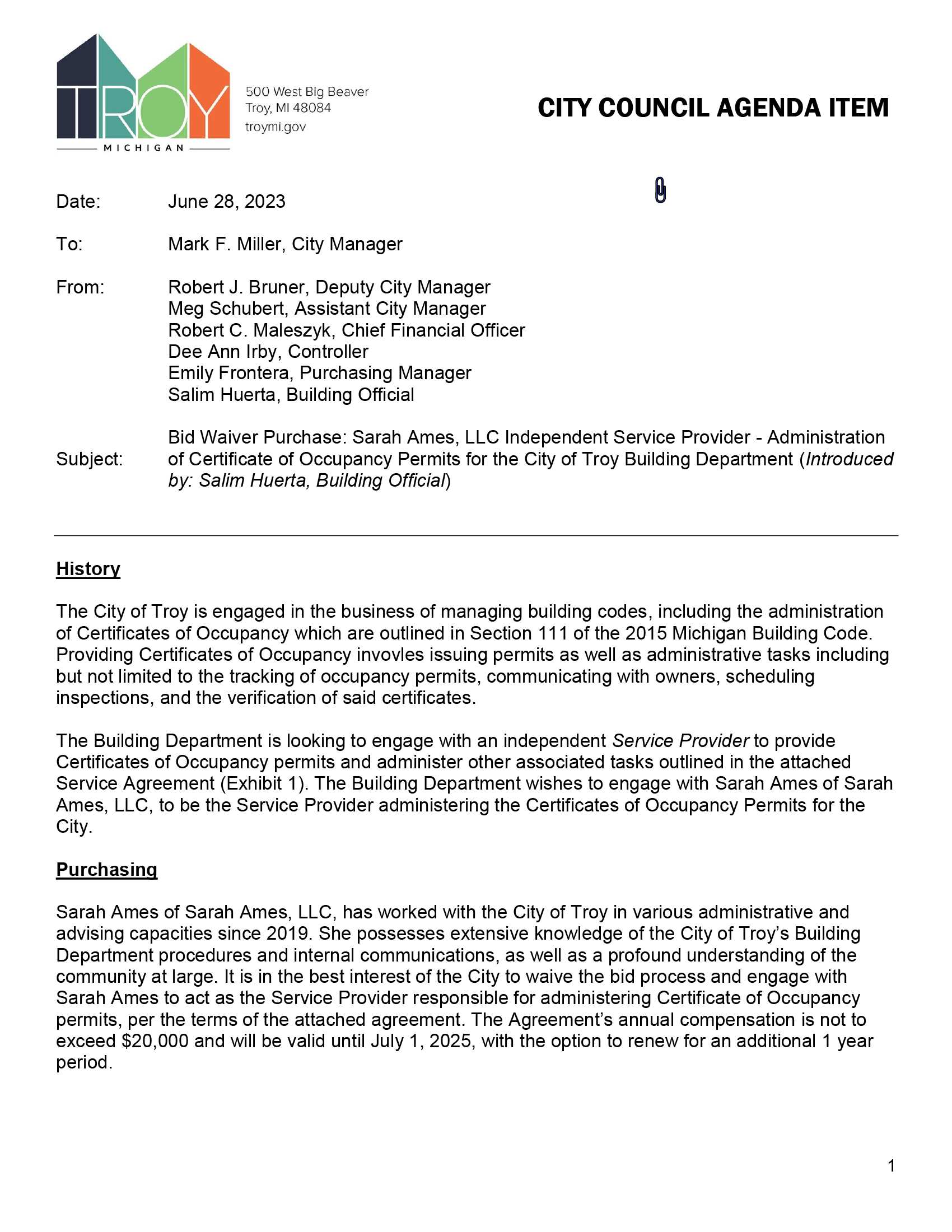 20230710 City Council Regular Agenda Item I06 Bid Waiver Purchase